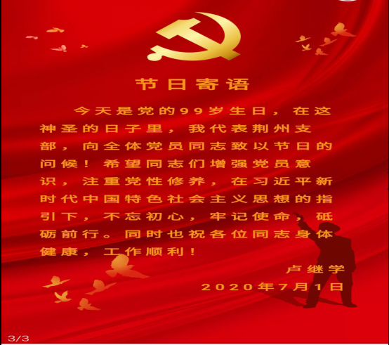 今天是党99岁生日,一大早,荆州支部全体党员便在党员微信群里,收到一张来自支部书记卢继学同志的建党节电子祝福卡,鲜红的画面、雄壮的音乐,还有他对大家的殷切寄语:“今天是党的99岁生日,在这个神圣的日子里,我代表荆州支部,向全体党员致以节日的问候!希望同志们增强党员意识,注重党性修养,在习近平新时代中国特色社会主义思想的指引下,不忘初心,牢记使命,砥砺前行!”