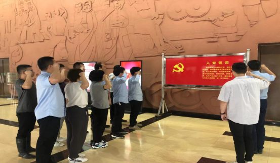 冒着细雨,支部党员及入党积极分子怀着无比崇敬之情,瞻仰了毛主席亲笔提名的二七烈士纪念碑。在展馆一楼大厅,在纪念二七铁路大罢工的大型浮雕下,面对鲜红的党旗,支部书记刘广同志带领新党员胡文宗同志及其他党员一起,重温入党誓词。