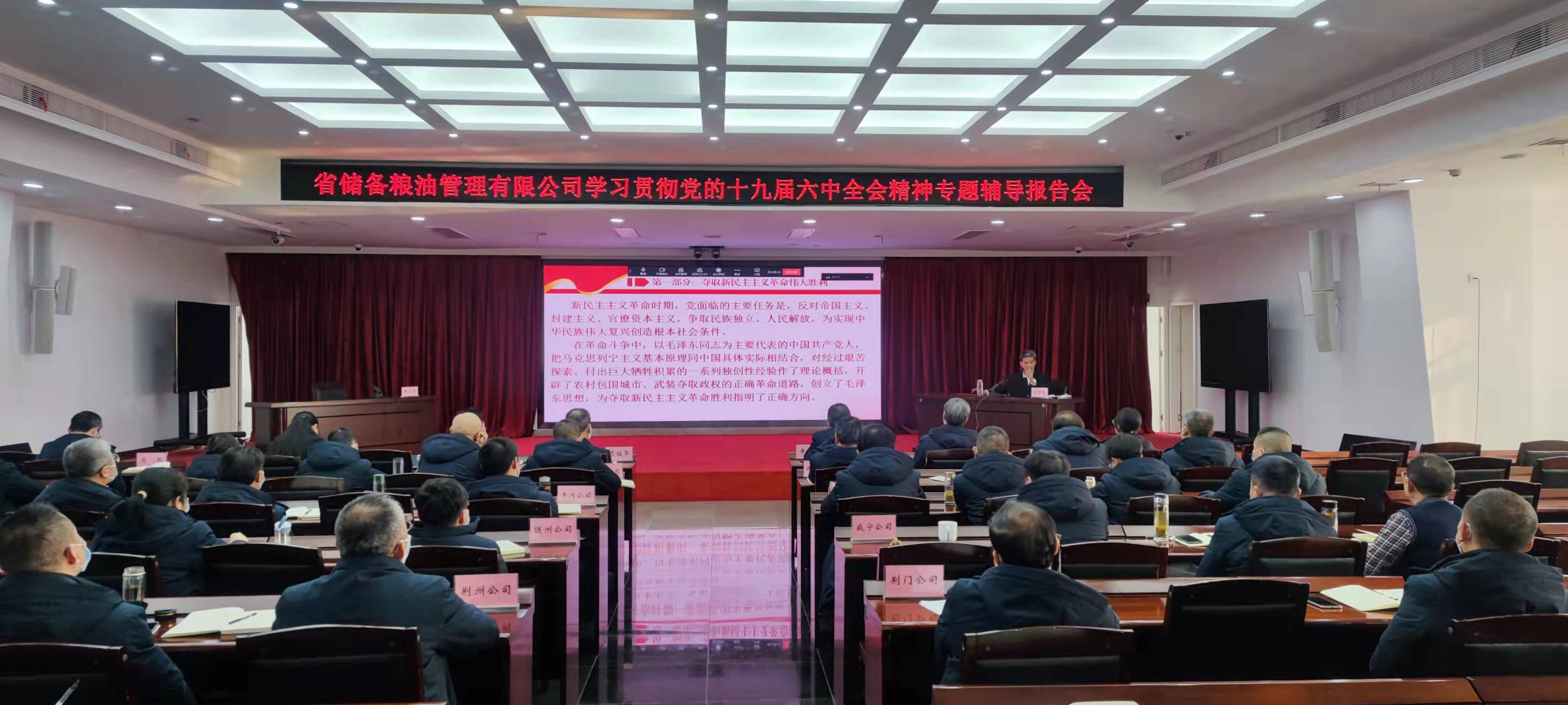 12月10日下午,省储备粮油管理公司组织开展学习贯彻党的十九届六中全会精神专题辅导暨党委理论学习中心组(扩大)专题学习。省直机关工委党校副校长彭晓保教授作题为“百年成就的科学《决议》 历史经验的伟大宣示”的专题报告。公司党委书记、董事长黄生斌参加并主持学习。