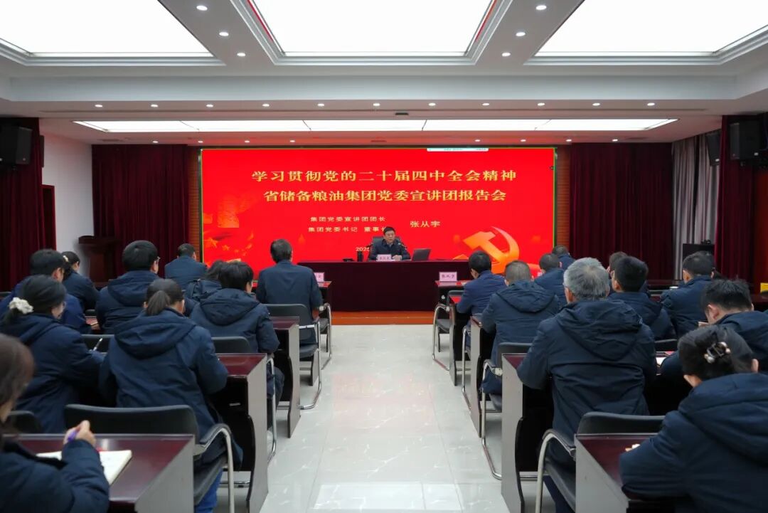 11月25日,省储备粮油集团召开学习贯彻党的二十届四中全会精神宣讲报告会。集团党委书记、董事长张从宇作专题宣讲,围绕“认真学习贯彻二十届四中全会精神,全面推进集团储备粮事业高质量发展”主题,对全会精神进行系统阐释和深入解读,推动全会精神在集团落地生根、见行见效。