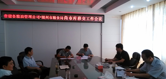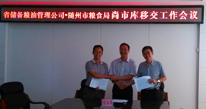 2014年7月22日,在随州市粮食局4楼会议室,以湖北省粮食局财会处唐学军处长为监交代表,随州市粮食局相关领导和我公司资产整合小组成员的见证下,黄生斌董事长和随州市粮食局张轶能局长正式签署了随州尚市粮库人财物移交表,标志着公司随州资产库整合工作顺利完成。