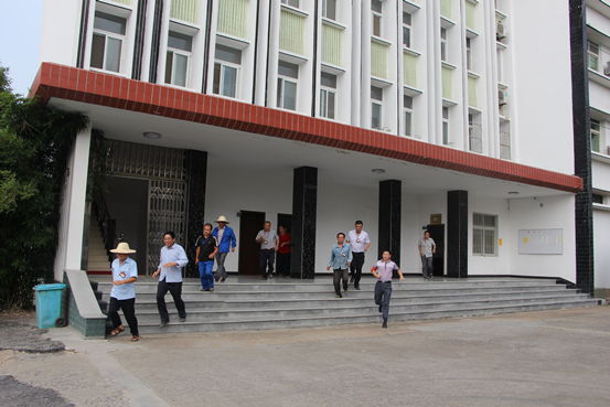 地点在办公楼,在听到一长一短的哨音后,办公楼内工作人员迅速按秩序撤离办公楼区域,用时30秒。