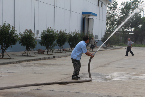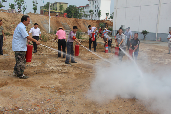 地点位于1-13、1-14库北面空地场,随着报警员报警后,总指挥董成华接警后,迅速通知公司各部部长及公司员工,用了2分钟拿来灭火器赶到着火点进行灭火,由抢险抢修组迅速启动消防泵,用水枪喷着火点,整个灭火演练过程用了10分钟。