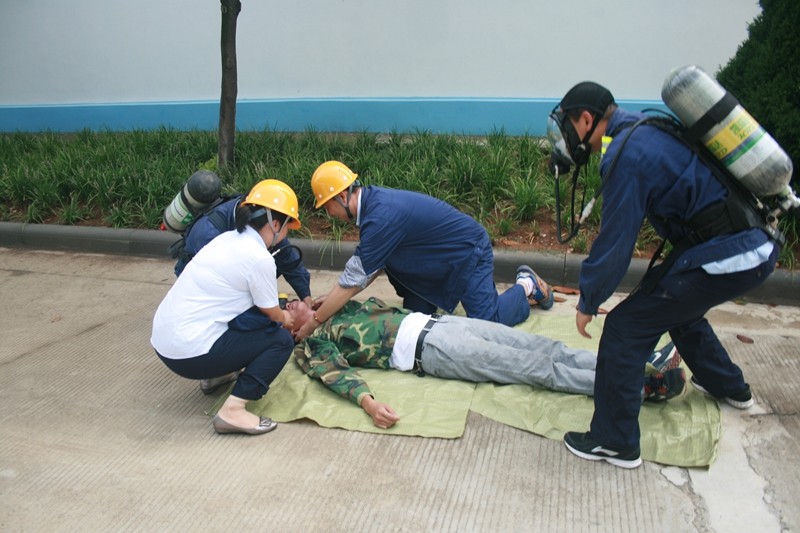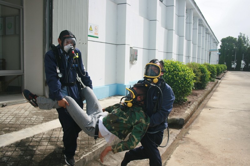 随后,储粮化学药剂仓内中毒抢救演练开始进行。随着指挥员的一声令下,突击抢救组的两名同志身着正压式呼吸机迅速进入事故仓内,给受伤人员戴上呼吸面罩,并将之搬运至通风安全的地方进行抢救,受伤人员成功脱险。通过演练,全体干部员工熟悉并掌握正压式空气呼吸机的工作原理及注意事项,突击抢救组、通讯联络组、救护组、警戒组设备组、现场清理组等6个小组人员各司其职,严格按照预案确定的程序进行,现场组织调度及时有序,演练各个环节衔接合理,分工协作,在规定时限内完成了演练任务。