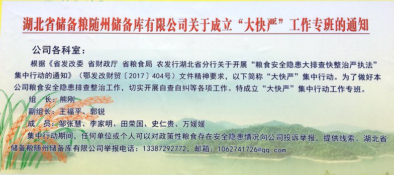 在公司开设专栏进行“大快严”集中行动专题宣传,利用公司展板宣传国家粮食收储政策、收购质价政策,政策公开化、透明化,同时接受群众监督,并公示监督举报电话和举报信箱。