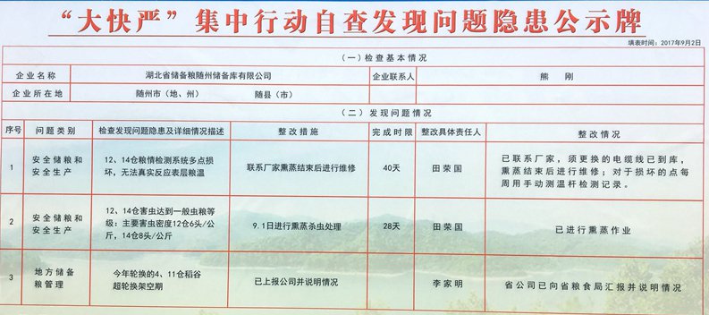 此次检查将作为年终绩效考核依据,在“大快严”集中行动中对工作不力、隐患排查整治不到位进行批评,并调整年终绩效考核标准;工作表现突出的,进行表扬。随州公司以此次“大排查快整治严执法”集中行动为抓手,确保粮食安全生产工作的隐患排查措施有效,落实到位,确保储备粮的安全。