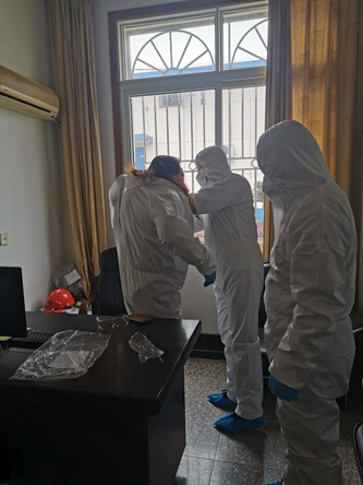 首先,信息组韩丹穿戴好个人防护用品后,前往龙芳所在办公室,为其测量体温,模拟其体温37.6℃;隔离组宋杰、刘吉兵第一时间到达现场,协助龙芳做好全套防护,将其带离办公室,安置到临时隔离室。