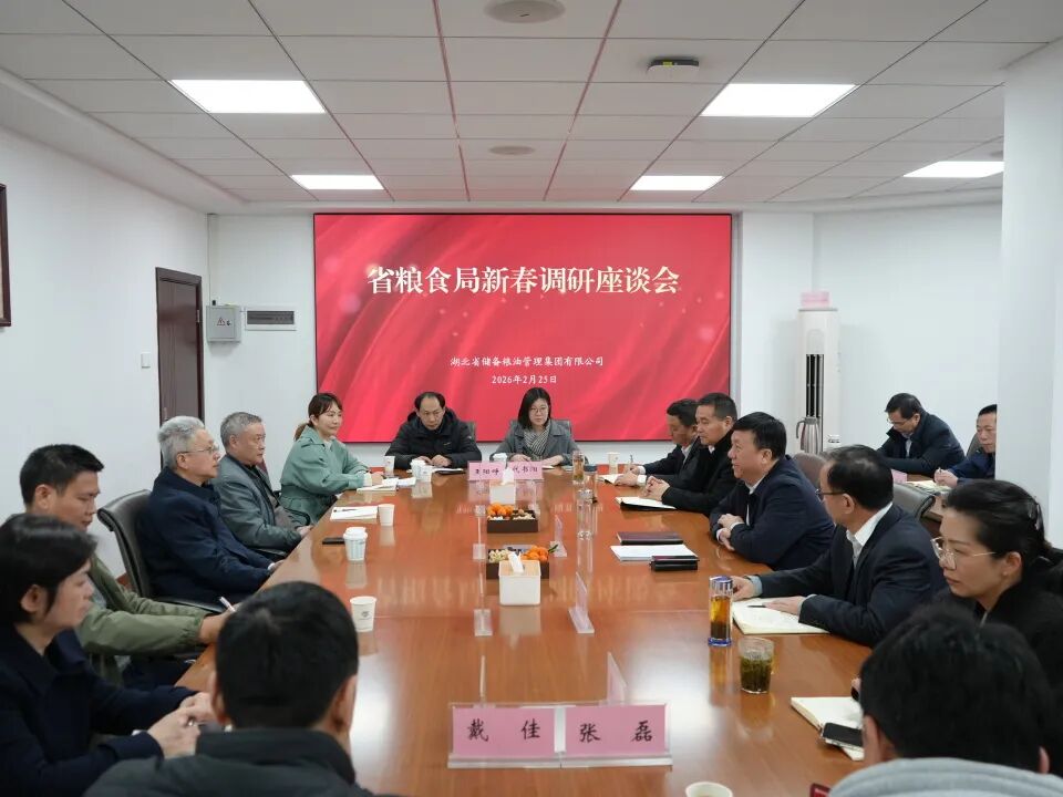 2月25日,省粮食局党组成员、副局长李硕一行到省储备粮油集团开展新春调研座谈。集团党委书记、董事长张从宇,党委副书记、总经理廖双文参加座谈。